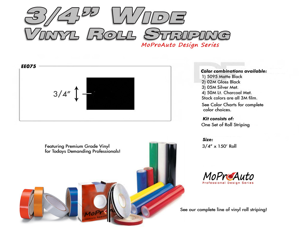 |   | | | 3/4th PIN STRIPING ROLL : Vinyl Roll Stripes Kit | | Fits Years | | Universal Fit | | Size | | 3/4th x 150ft Roll | | Contents | | One Box of Pin Striping Roll Tape | | Description and Features | | DESCRIPTION The MoProAuto Original! Pin Striping and Roll Stripes are the classic way to accent the body lines of cars, trucks, boats and much more! If you are looking for stripe rolls, automotive pinstriping rolls, vinyl roll stripes, car pinstripes, truck pin striping, boat stripes or printed roll stripes, we have a wide selection to choose from for your automotive needs! These pinstriping rolls and roll striping come in a variety pf sizes, and will fit many different makes, models and model years. The sizes available will be listed, just choose from the menu the options needed, including the premium cast automotive vinyl grade and vinyl color. Perfect Fit Every Time : Each pin striping roll is a MoProAuto Pro Design Series kit, and has been test fitted and sold to and installed on automotive dealer lots across the country before being made available to the general public, so you know this is a professional quality vinyl product. Application Fitment : These professional quality Stripe Roll Kits fit many different makes and models, just take note of the measurements and compare with your vehicle to get an idea on where to install. FEATURES - Superior Quality Vinyl Material from 3M and Avery