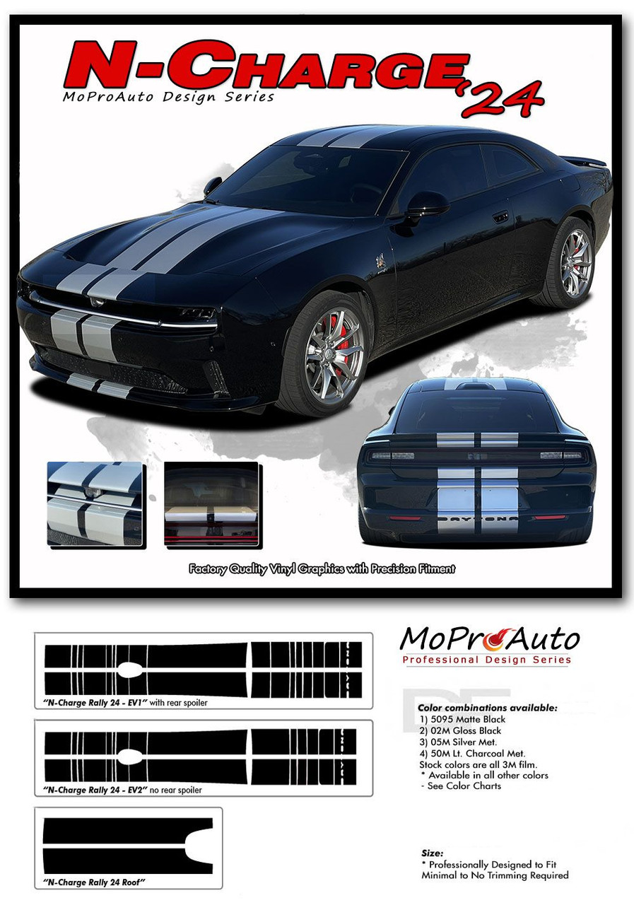 The MoProAuto Original! The Dodge Charger RV is quickly becoming a go to vehicle for popular vinyl graphics and racing stripes, especially if you are an automotive dealer. This vinyl stripe a rally stripe OEM style, and is a bumper to bumper racing stripe package designed for the 2024, 2025, 2026 Dodge Charger. The vinyl graphic sections included with this vehicle specific kit are the bumper stripes, hood stripes, roof stripes, trunk stripes, and spoiler vinyl graphic accent decals. Choose the options needed from the menu, including the premium cast vinyl grade. Perfect Fit Every Time : Each vehicle specific MoProAuto Pro Design Series Vinyl Graphic Kit is pre-designed, test fitted, and sold to auto dealers before being made available to the general public, for a perfect fit with little to no trimming needed. Application Fitment : These professional quality MoProAuto Pro Design Series Vinyl Stripe Kits fit Dodge Charger from 2024, 2025, 2026 model years.