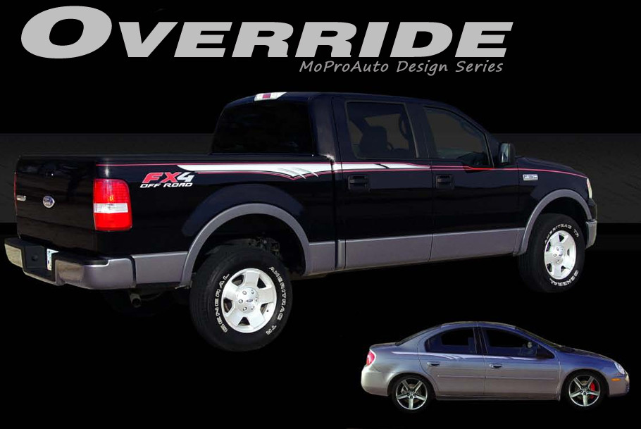 |   | | | OVERRIDE : Universal Fit Vinyl Graphics Decals Stripes Kit | | Fits Years | | Universal Fit | | Size | | 91.9" x 4.4" per side - Ready to Install | | Contents | | Driver and Passenger Sides Included | | Description and Features | | DESCRIPTION The MoProAuto Original! "Universal Fit" vinyl graphics will add a unique style and will work with many makes and models. Accent the body lines of many cars, trucks, boats and much more! If you are looking for vinyl striping for the doors or lower rocker panel of your car or truck, we have a wide selection to choose from for your automotive needs! These vinyl graphics come in a variety of sizes, and will fit many different makes, models and model years. See pictures for the sizes available, and choose from the menu the options needed including the premium cast automotive vinyl grade and vinyl color. Perfect Fit Every Time : Each universal fit vinyl graphic stripe is a MoProAuto Pro Design Series kit, and has been test fitted and sold to and installed on automotive dealer lots across the country before being made available to the general public, so you know this is a professional quality vinyl product. Just take note of the measurements of this vinyl graphic, and compare with your vehicle to get an idea of how to install. Application Fitment : These professional quality universal fit vinyl kit will work with many different makes and models, just take note of the measurements and compare with your vehicle to get an idea on where to install. FEATURES - Superior Quality Vinyl Material from 3M and Avery
