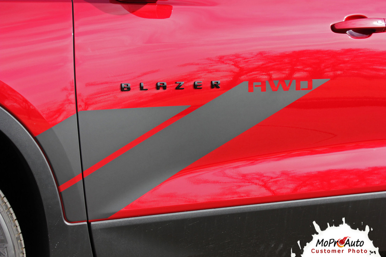 The MoProAuto Original! This is an OEM inspired style side door graphic accent stripe package, designed to fit the 2019, 2020, 2021, 2022, 2023, 2024, 2025, 2026 Chevy Blazer LT, RS, Premier models. The decal sections included with this vehicle specific vinyl graphic are one driver and one passenger side graphic striping sections, with your choice of AWD text or no text. Choose the options needed from the menu, including the premium cast vinyl grade.