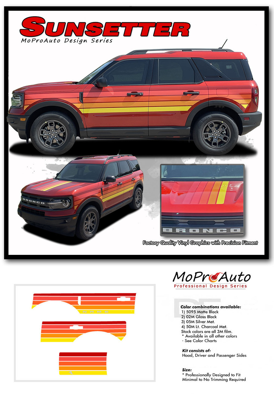 The MoProAuto Original! The Ford Bronco is back and ready for some off-road action! Add personality to your Ford Bronco with an auto vinyl graphic style! We offer specially designed vinyl stripes including upper door stripe kits, lower body side stripes, hood graphics, and truck body stripe kits for the Ford Bronco models. This Bronco Sport SUNSETTERS vinyl graphic accent kit is designed for the 2021, 2022, 2023, 2024, 2025, 2026 Ford Bronco Sport. The vinyl stripe sections included with this vehicle specific vinyl graphic are hood, driver and passenger side body vinyl decal stripes as shown. Choose the options needed from the menu on this page, including the premium cast automotive vinyl grade.
